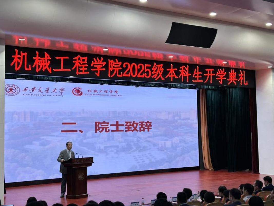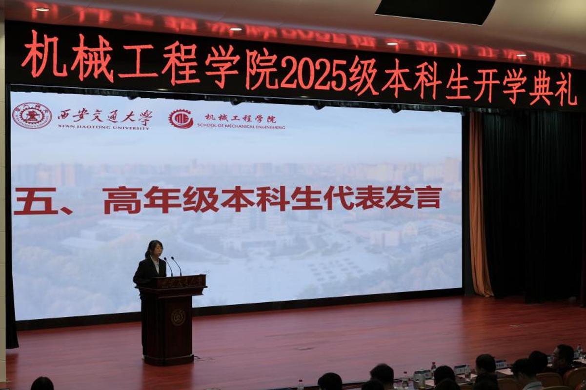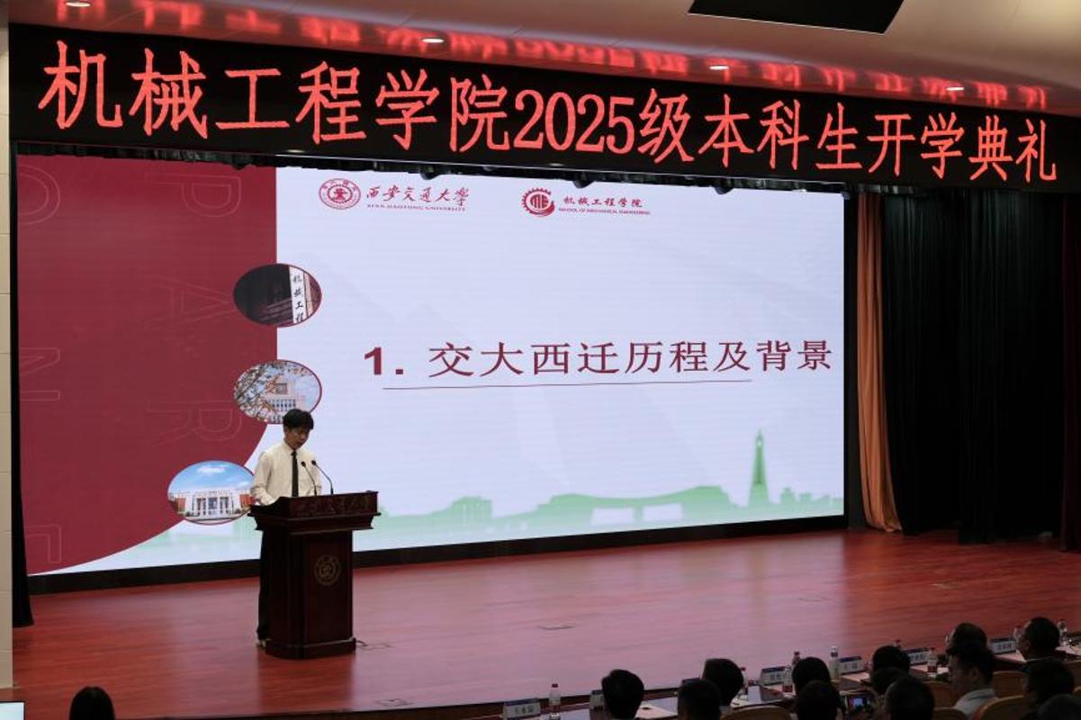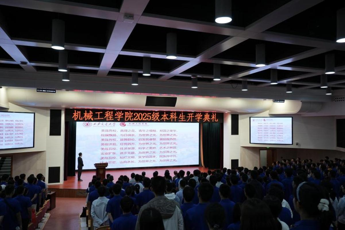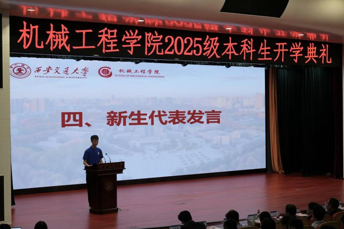 机械2507班王乾戌做为重生代表讲话。2025级本科生开学仪式落幕。讲述谢友柏院士等西迁前辈的故事。他分享了入学感触感染、专业认知、军训,他以“大学之道,践行“精勤肄业,